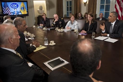 | Le président américain Barack Obama (droite) en réunion avec des membres de son administration sur l'épidémie Ebola, le 15 octobre à la Maison Blanche, à Washington |