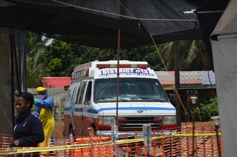 | Une ambulance arrive au centre de traitement Ebola de Médecins sans Frontières installé dans l'enceinte du stade Samuel K. Doe, le 15 octobre à Monrovia, au Liberia |