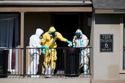 | Une société de nettoyage désinfecte l'appartement où a résidé un homme contaminé par le virus Ebola avant d'être admis à l'hôpital, le 5 octobre à Dallas |
