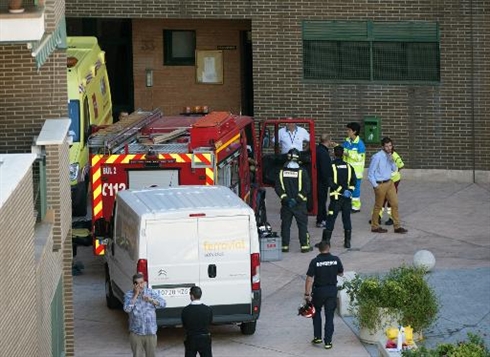 | Des équipes sanitaires et des pompiers devant l'entrée du domicile de l'aide-soignante espagnole contaminée par le virus Ebola, le 8 octobre à Alcorcon, dans la banlieue de Madrid |