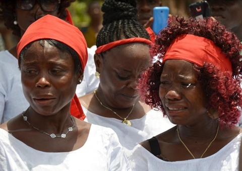 | Des femmes pleurent des morts victimes du virus Ebola près de leurs tombes, le 7 mars 2015 à Monrovia. |