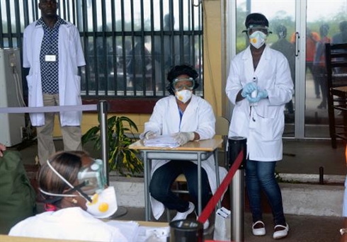 | Une équipe médicale contrôle les passagers au départ de Monrovia, le 27 août |