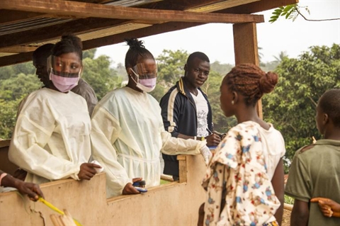 | Du personnel de santé de Sierra Leone contrôle les entrées à Jendema, à la frontière avec le Liberia, le 28 mars, pour détecter d'éventuels cas d'Ebola. |