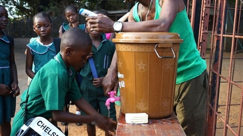 | Image tirée d'une vidéo montrant des enfants en train de se laver les mains à la rentrée des classes le 14 avril dans une école de Freetown, la capitale de la Sierra Leone |