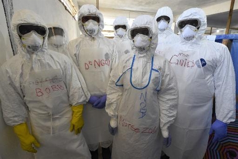 | Du personnel de santé au centre de l'Organisation mondiale de la santé à Monrovia au Libéria, le 3 octobre. |