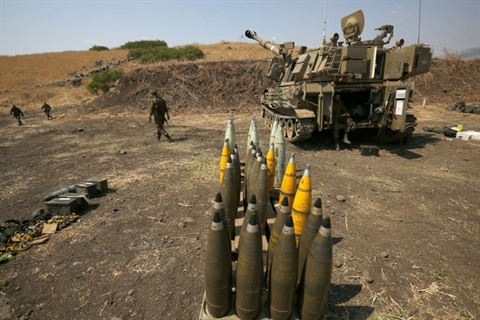 | Des obus posés à terre près d'un canon à propulsion, dans la périphérie de la ville israélienne de Kyriat Shmona (Nord), près de la frontière avec le Liban, le 1er septembre 2019. |