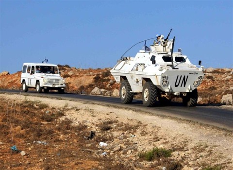 | Des véhicules de la Finul, la force des Nations unies déployée dans le sud du Liban, photographiés près du village de Kfar Kila, près de la frontière avec Israël, le 1er septembre 2019. |