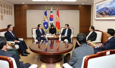 | Séance de travail entre Nguyên Thành Cung (droite) et Baek Seung-joo, le 30 septembre à Séoul. |
