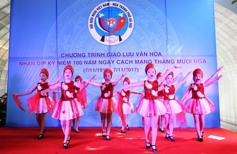 | Un numéro artistique lors du programme d'échanges culturels à l’occasion du centenaire de la Révolution russe d’Octobre, le 4 novembre à Hanoï. |
