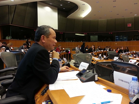 | L’ambassadeur du Vietnam Vuong Thua Phong, chef de la Délégation du Vietnam auprès de l’Union européenne, lors de la séance d’échanges de vue sur les négociations de l’EVFTA, le 24 février à Bruxelles. |