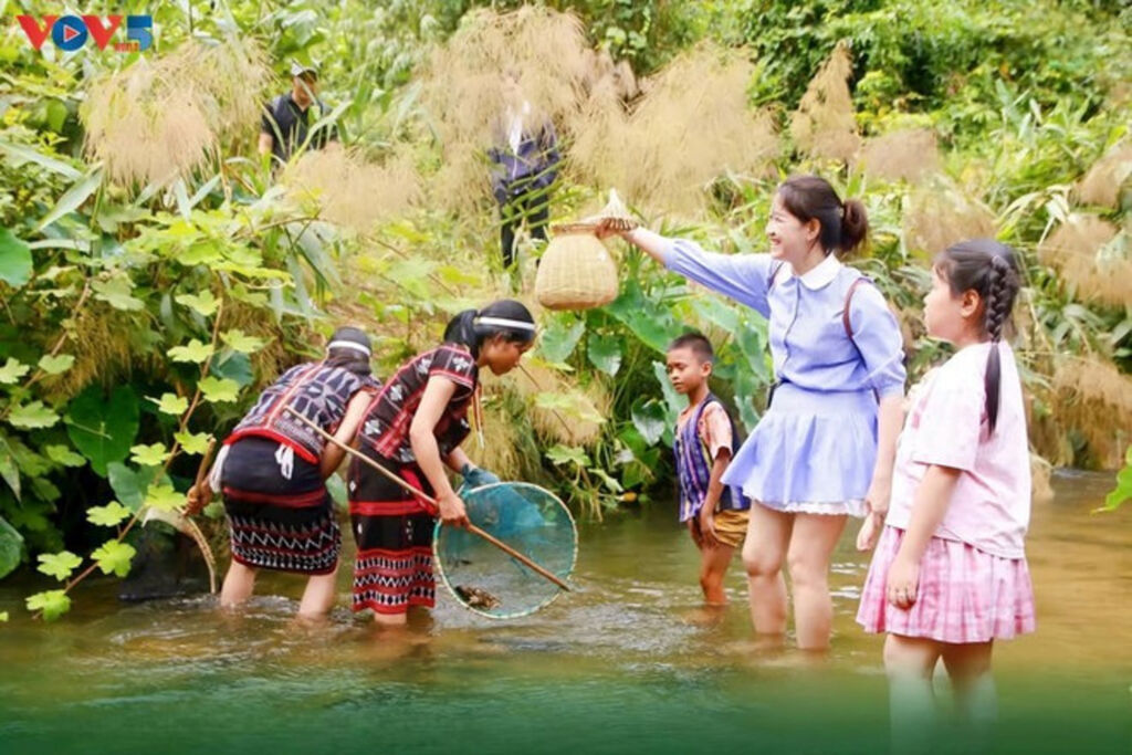| Deux touristes participent à une activité de pêche en rivière aux côtés de la communauté Co Tu. |