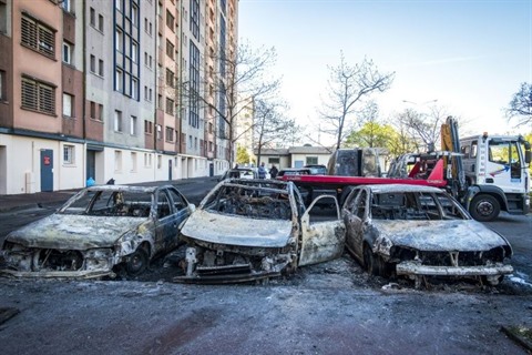 | Voitures calcinées sur le parking d'une cité de Bagatelle, à Toulouse, le 17 avril |