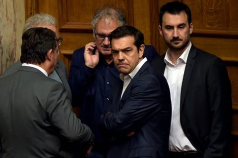 | Le Premier ministre grece Alexis Tsipras (au centre), lors de l'examen au Parlement des nouvelles mesures d'austérité, à Athènes le 18 mai. |