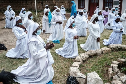 | Des fidèles rassemblés pour la première fois depuis mars, dans le bidonville Kebera de Nairobi, le 19 juillet. |