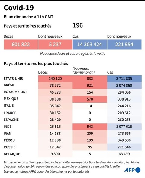 Le COVID-19, qui a contaminé plus de 14 millions de personnes et fait au moins 601.822 morts depuis fin décembre, selon un bilan établi dimanche 19 juillet par l'AFP, continue de se propager ou reprend dans de très nombreux pays.