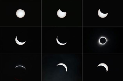 | Montage montrant la lune passer devant le soleil pendant une éclipse totale vue à Ternate dans les îles Maluku en Indonésie, le 9 mars. |