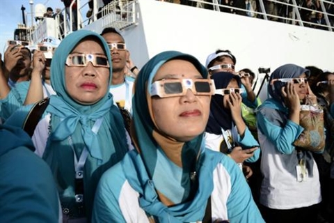 | Des passagers du navire de croisière KM Kelud près de l'île de Belitung en Indonésie regardent une éclipse totale du Soleil, le 9 mars. |