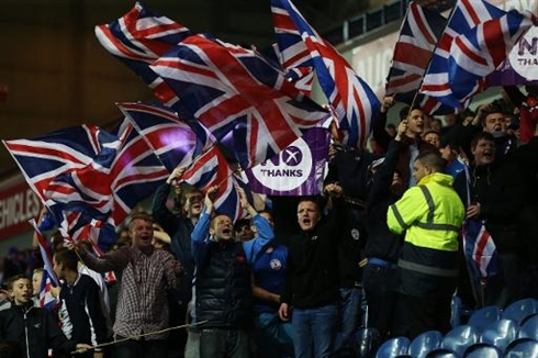 | Des partisans au "non" à l'indépendance de l'Écosse rassemblés le 16 septembre à Glasgow. |