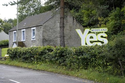 | Un slogan prônant le oui à l'indépendance de l'Ecosse affiché le 30 août 2014 dans le Perthshire. |