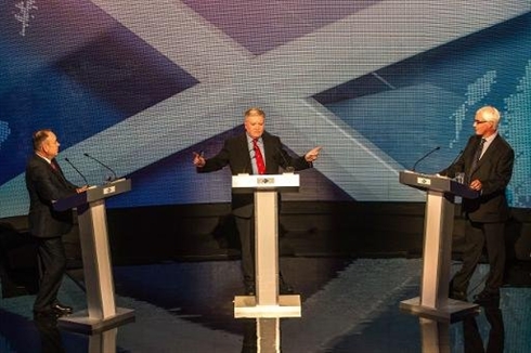 | Débat entre les dirigeants des deux camps du référendum sur l'Écosse, le 5 août à Glasgow |