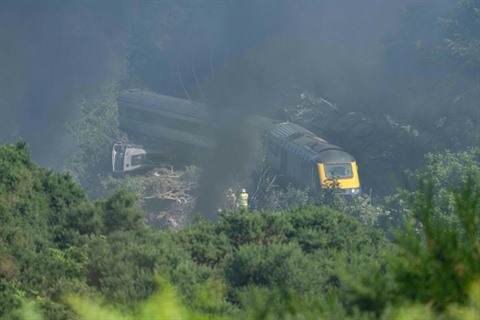 | Des services de secours sont sur les lieux du déraillement du train le 12 août, à Stonehaven (Nord-Est de l'Ecosse). |
