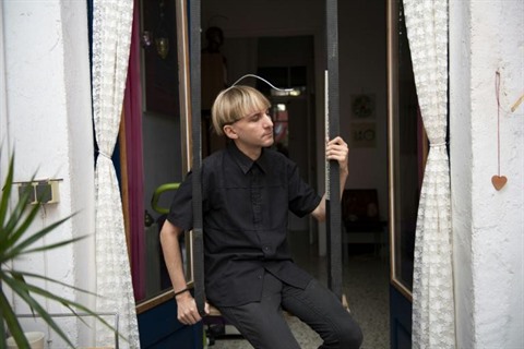 | Neil Harbisson porte une antenne fixée dans son crâne lui permettant de transformer les couleurs en sons pour les entendre comme de la musique, le 23 septembre à Mataro, près de Barcelone |