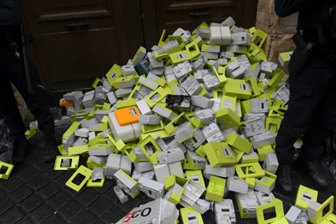 | Des compteurs Linky déversés le 19 janvier 2021 devant le siège de La République en marche à Paris, par des agents d'EDF protestant contre le projet "Hercule" de scission de l'énergéticien. |