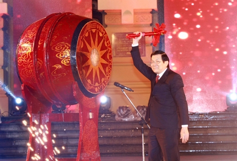 | Le président Truong Tân Sang frappe, le 31 janvier, le tambour pour marquer l’ouverture du programme. |