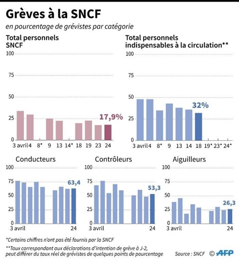 Mardi 24 avril, au cinquième épisode de la grève entamée début avril sur un rythme de deux jours sur cinq, le taux de grévistes s'élevait à 17,87% à la mi-journée, selon la direction de la SNCF. Néanmoins, la mobilisation des agents indispensables à la circulation des trains reste élevée avec notamment 63,4% des conducteurs mobilisés.