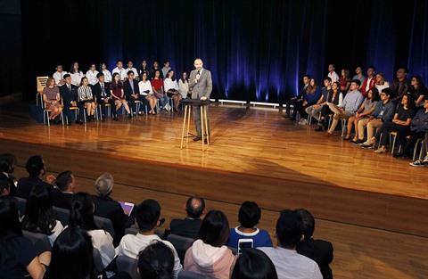 | Le Premier ministre français Édouard Philippe (debout) au Lycée français Alexandre Yersin, le 3 novembre à Hanoï. |