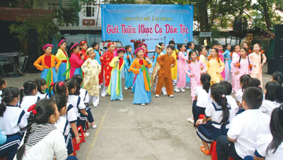 Il y a quelques semaines, c'est la première fois que l’école primaire Minh Dao organisait, pour ses 800 élèves, ce type d'évènement. À cette occasion, de nombreux instruments traditionnels ont été présentés, comme la viole à deux cordes, le monocorde, le luth à caisse ronde et à deux cordes, la cithare à 16 cordes, le t’rung (xylophone en bambou, très populaire auprès des minorités ethniques des hauts plateaux du Centre), la flûte, le tam-tam (tambourin oblong), le tambourin, la cloche en bois, l'ensemble des instruments de percussion… Le présentateur du programme, l’Artiste Émérite Pham Thuy Hoan, a fait une démonstration avec quelques morceaux: Ca nhà thuong nhau (l'amour des familles), Di hoc (va à l’école), Cô và me (institutrice et mère), Trông com (tam-tam), etc. «Ce programme est très utile pour les élèves. Car à la suite de cet évènement, ceux de 4e et de 5e feront un compte-rendu et décriront leurs impressions», a fait savoir le directeur de l’école primaire Minh Dao.