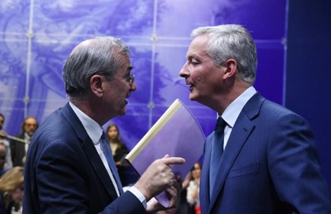| Le gouverneur de la Banque de France Francois Villeroy de Galhau et le ministre de l'Économie Bruno Le Maire, lors d'une conférence à Paris le 16 juillet 2019. |