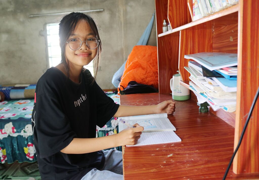 | Han Thi Ngoc Tiên, une lycéenne de An Phuoc, district de Ninh Phuoc, est un bon exemple d'élèves qui surmontent les difficultés et étudient bien. |