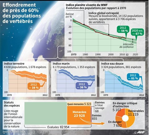 "Le déclin subi par les populations d'espèces sauvages est de plus en plus préoccupant", souligne-t-il : "Il devrait atteindre en moyenne 67%" d'ici à 2020, si rien n'est fait pour enrayer la tendance.