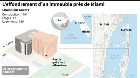 | Localisation et schéma d'un immeuble qui s'est partiellement effondré près de Miami. |