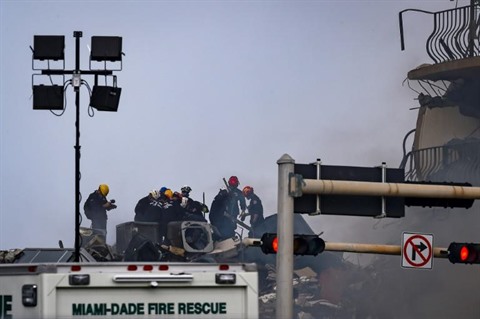 | Opérations de secours sur les ruines de l'immeuble effondré de Surfside, aux États-Unis, le 26 juin. |