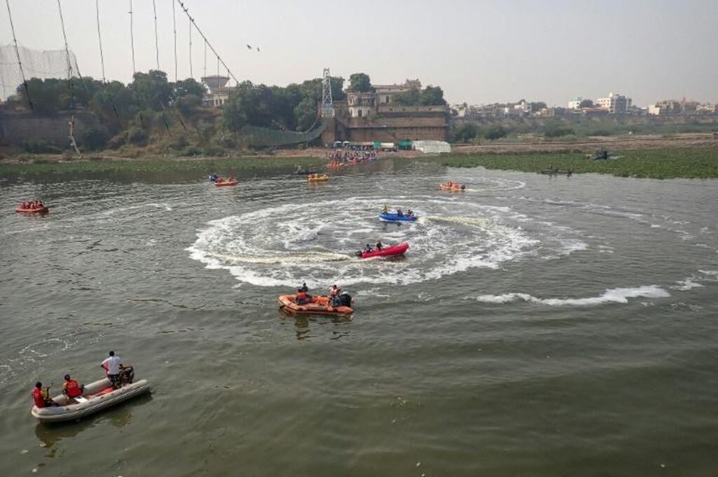 | Opérations de secours le 1er novembre à Morbi, après l'effondrement d'un pont en pleine fête de Diwali deux jours plus tôt. |