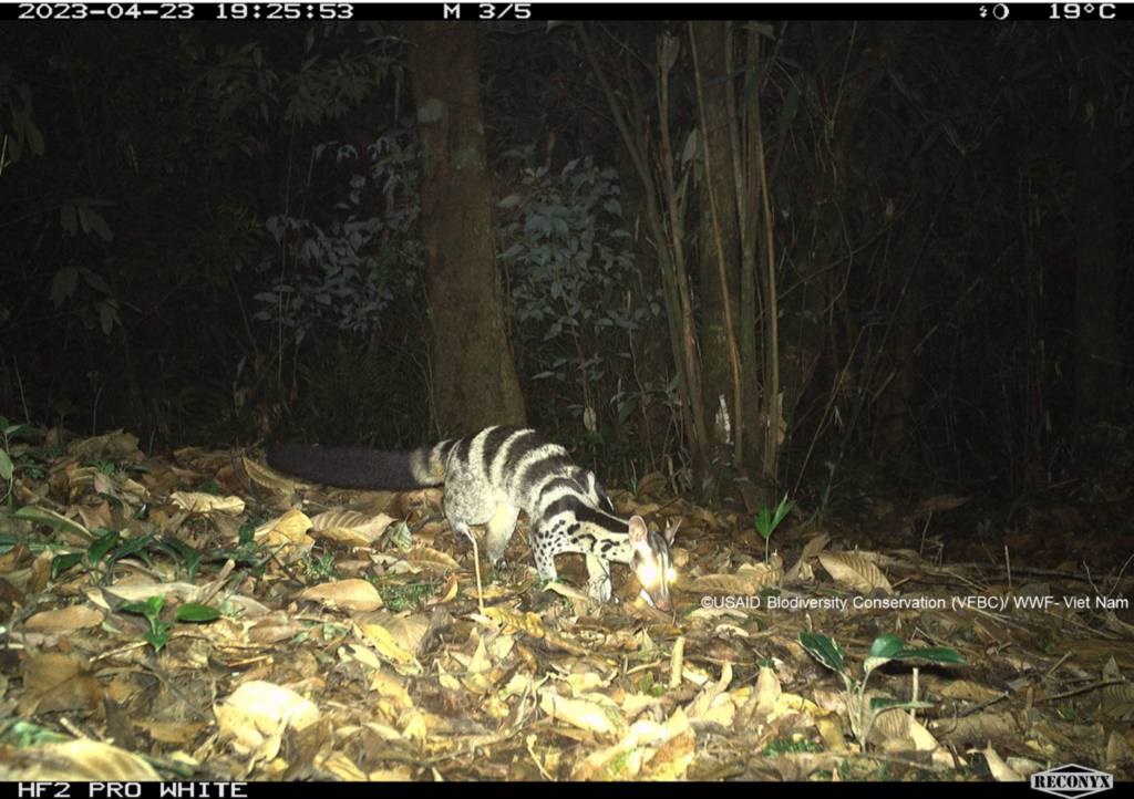| Civette photographiée en 2023 dans le Parc national de Vu Quang, province de Hà Tinh (Centre). |