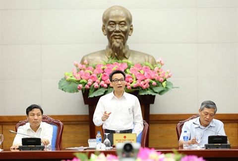 | Le vice-Premier ministre Vu Duc Dam (debout) lors d'une rencontre avec la communauté des jeunes entreprises, le 12 août à Hanoi |