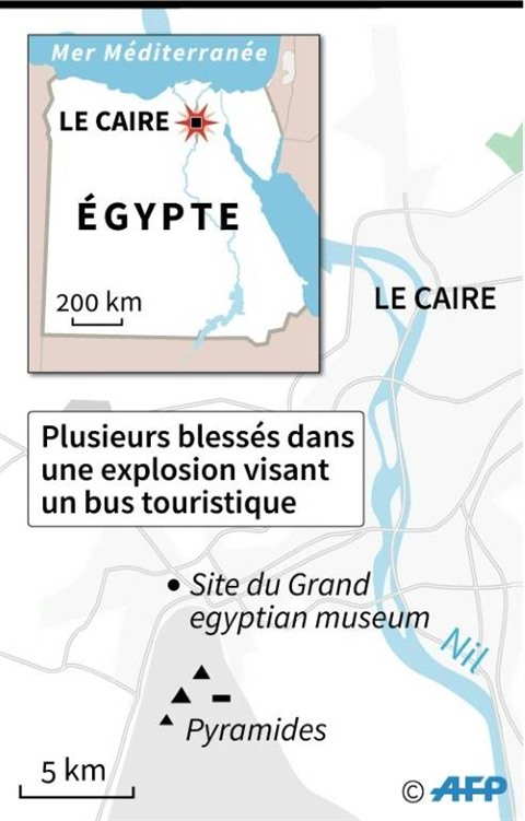 Un engin explosif a détoné au passage de l'autocar de tourisme, qui circulait à Guizeh, près du chantier du nouveau musée des Antiquités égyptiennes, au pied des pyramides.