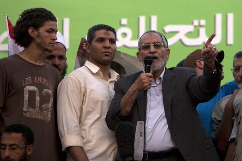 | Le guide suprême des Frères musulmans, Mohamed Badie (droite), le 5 juillet au Caire. |