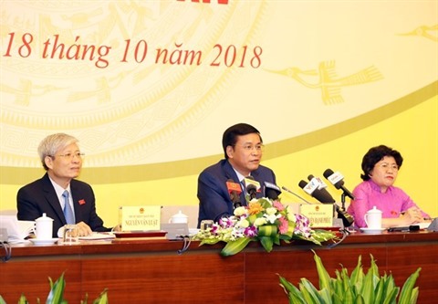 | Le secrétaire général de l’Assemblée nationale et chef du Bureau de l’Assemblée nationale, Nguyên Hanh Phuc (centre), lors de la conférence de presse, le 18 octobre à Hanoï. |