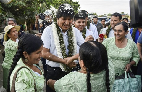 | Des partisans du président boliven Evo Morales accueillent leur candidat venu voter à Chapare, le 20 octobre. |