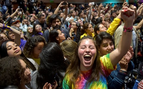 | Des partisans de la nouvelle maire de Bogota, Claudia Lopez, à l'annonce de sa victoire, le 27 octobre 2019 dans la capitale colombienne. |