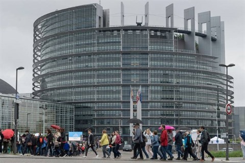 | Des visiteurs devant le Parlement européen à Strasbourg, le 19 mai. |