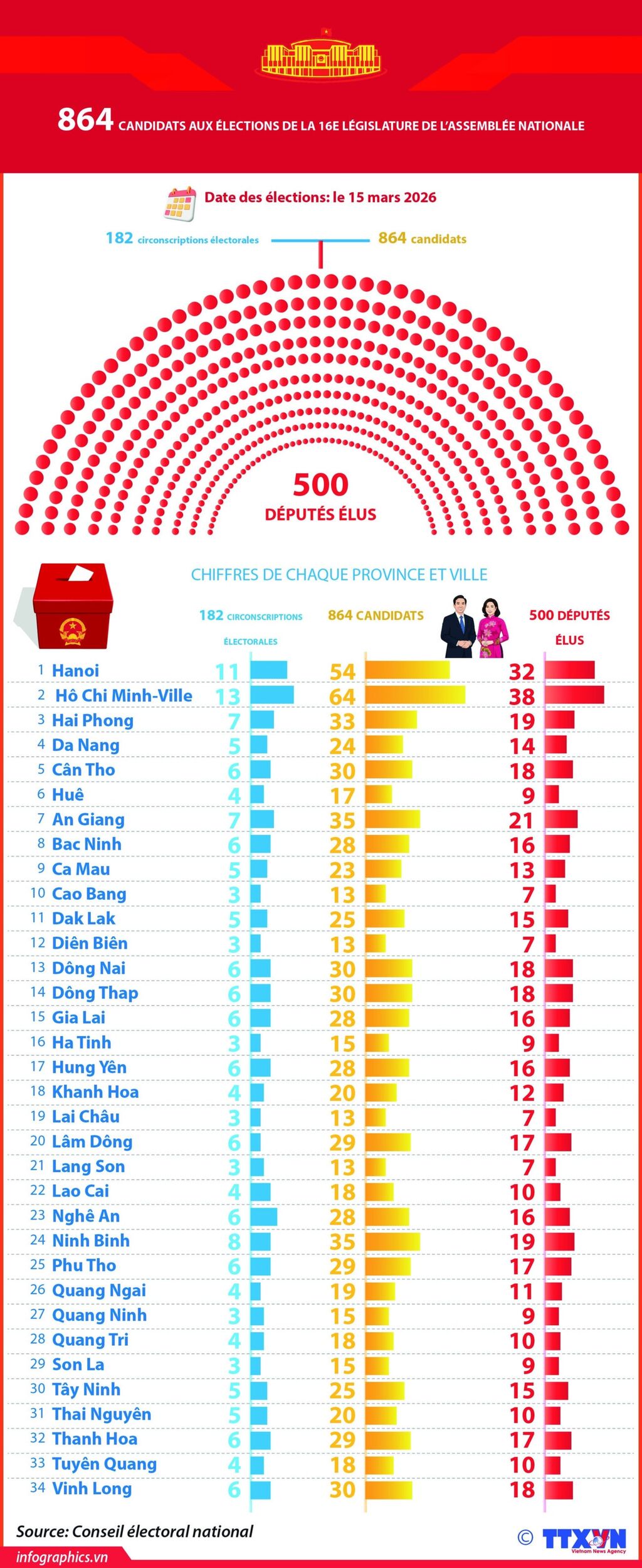 À Hô Chi Minh-Ville, les listes des électeurs sont affichées depuis le 3 février. Du 5 au 10 mars, la ville a procédé à l'impression et à la distribution des cartes d'électeurs, ainsi qu'à la préparation du matériel électoral. Des délégations d'inspection supervisent et guident les localités pour garantir le respect du calendrier.