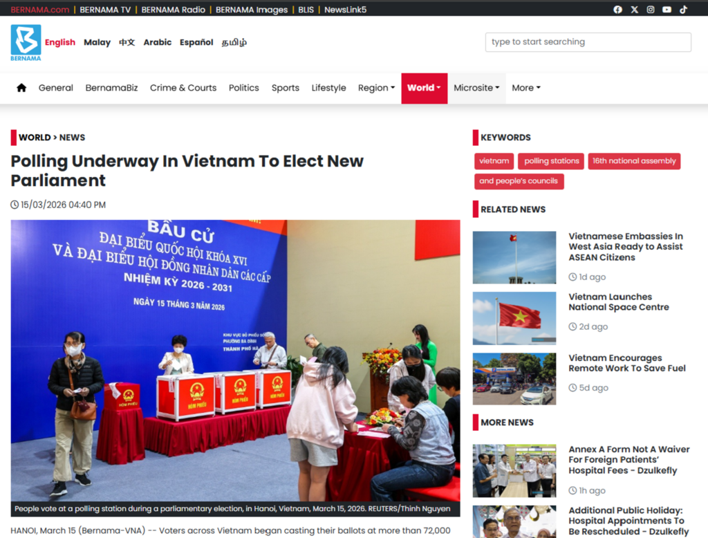 Le quotidien malaisien The Star a également publié une analyse approfondie sur ce scrutin quinquennal visant à élire les 500 députés de la XVIe législature de l’Assemblée nationale. Le journal souligne que cet événement incarne le droit de maître du peuple, permettant aux citoyens de choisir des représentants exemplaires capables de porter leur volonté et leurs aspirations au sein des instances du pouvoir d'État.