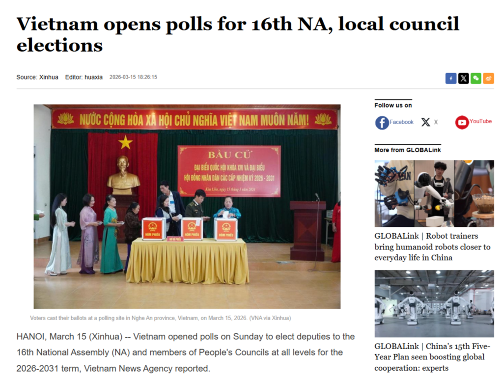 D'autres médias d'envergure, tels que l'agence de presse russe Sputnik, la télévision centrale de Chine (CCTV), l'agence de presse nationale cubaine Prensa Latina ainsi que plusieurs agences de presse occidentales, ont largement couvert ce scrutin national du Vietnam.