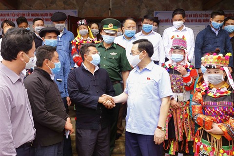 | Le président de l'Assemblée nationale Vuong Dinh Huê (premier plan, droite) lors de sa mission dans la province de Hà Giang. |