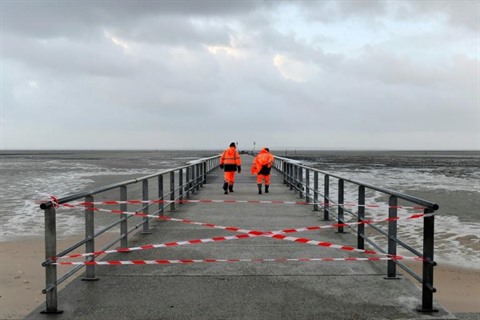 | Des employés de la municipalité sur la jetée, interdite aux promeneurs, d'Andernos, sur le bassin d'Arcachon, le 22 décembre après le passage de la tempête Fabien. |